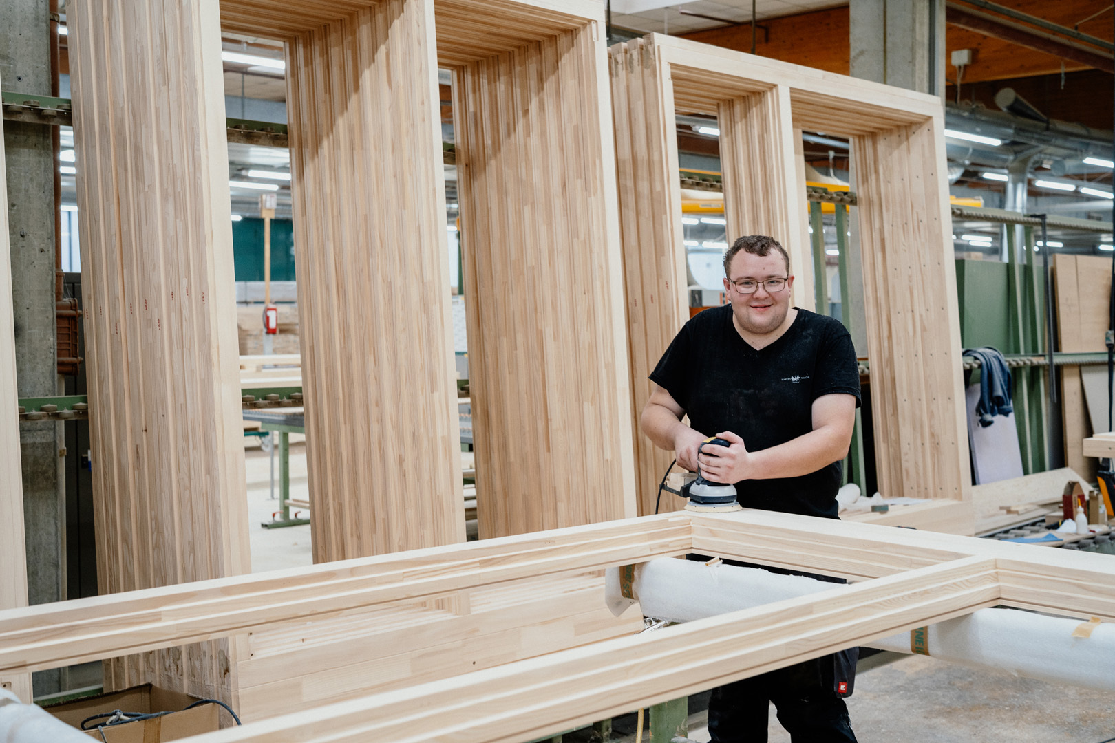 Durch sägen, schleifen und hobeln wirst du aus dem Naturprodukt Holz Fenster und Türen in unserer Fertigung herstellen